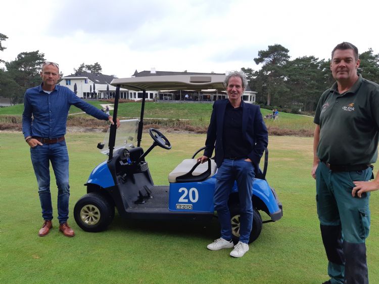 | | Bart Hooghiemstra, Peter Hemmen en Eric Metselaar met de nieuwe EZGO-golfkar |