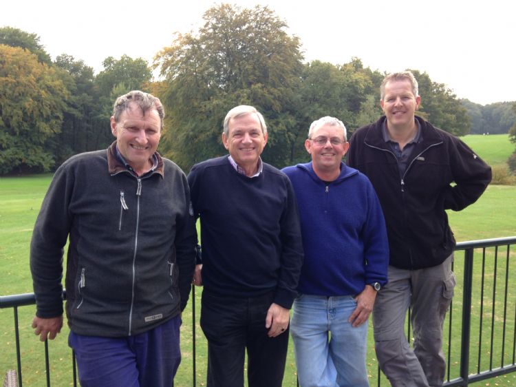 Jan Brummel (links) met v.l.n.r. voormalig baancommissaris Wim Telgen en collega-greenkeepers Harrie Balster en André van der Woude.