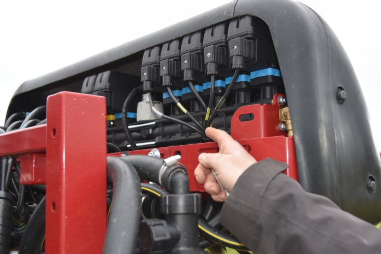 Nouws Mechanisatie kreeg de machine nagenoeg compleet af fabriek aangeleverd, inclusief een test op de afgifte van de juiste hoeveelheid spuitvloeistof aan de spuitmonden. In hun werkplaats werden voor aflevering alle hydraulische, elektrische en pneumatische systemen opnieuw uitgebreid getest. De gevoelige, elektrisch bediende spuitsecties aan beide uiteinden van de spuitboom zijn enigszins beschermd. Dat is gerealiseerd door het staal van de spuitboom circa 40 centimeter extra te laten uitsteken. Van Nijnatten: 'Wat ons restte, was de montage van de gps-antenne op de spuitmachine, het afstemmen van de configuratie van de machine op de tractor en het gps-systeem. En verder hebben we het gebruikersscherm in de tractorcabine gemonteerd. Daarnaast hebben we twee werklampen geïnstalleerd die in de spuitnevel schijnen. Hierdoor kan de machinist zelfs overdag aan de nevel zien of er een spuitdop verstopt is.'