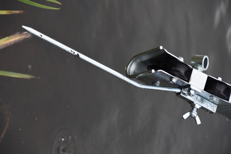 De hoofdgreenkeeper heeft zo'n pvc-verzamelput opgegraven waarin meerdere drainagereeksen hun water afvoeren. Vanuit deze verzamelput gaat er één waterafvoer naar een vijver op enige afstand. Eima heeft voor deze klus een drietal gevulde ICB-containers bij de werkplek laten neerzetten. De bovenkant van de opgegraven verzamelput zat ongeveer 50 cm onder het maaiveld en was afgesloten met een rond deksel van circa 30 cm. Daarbovenop lag een met grond afgedekte betontegel. Eima wijst erop dat de bovenkant heel handig aangestreken is met een metaalhoudende pasta. 'De posities van alle drainreeksen, met een diameter van 60, 80 en 100 mm, staan hier keurig op papier. Meestal liggen ze op een afstand van 5 tot 10 m van elkaar. Kleine inzinkingen in de fairway verraden waar de putten zich bevinden. Dankzij de aangebrachte metaalpasta kan ik echter de exacte plaats van de putten met een metaaldetector vinden.' We zijn benieuwd of de drainagereiniger de scherpe bocht onder in de put inderdaad kan maken. Doornbos had zich namelijk al op de hoogte gesteld van het feit dat de putten hier dezelfde diameter hebben als die van straatkolken. 'Dus', zo zegt hij, 'dan moeten we hier ook in kunnen komen, maar wel met een specifiek onderdeel hiervoor. Naast de standaard geleiding die we net gebruikten, hebben we onder meer een rail die een veel kortere boogstraal heeft. Daardoor vormt het automatisch invoeren met één man ook hier geen enkel probleem.' De hoogteverstelling van de mechanische geleidingsarm met rollenbocht door middel van een geremde lier bewijst ook hier zijn diensten: deze maakt het gemakkelijk om zowel horizontaal als verticaal de spuitmond diep onder in de put voor de opening van de drainagebuis te plaatsen.