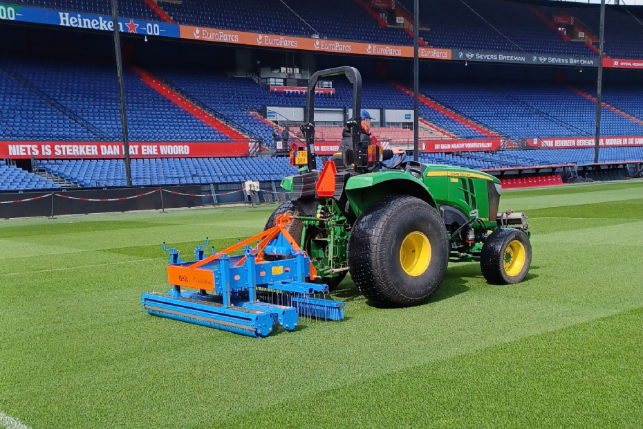 Kraaijeveld zoomt in op de Combislit. 'Deze machine is de nieuwste innovatie van GKB. De Combislit is een multifunctionele machine voor toplaagbeluchting tot 16 cm. Ook kunnen er spijkerrollen in gezet worden, evenals snijschijven. Deze nieuwigheid hebben we onlangs op de Vakbeurs Sportaccommodaties gepresenteerd; we komen er nu voor het eerst mee naar het veld. De Combislit is eenvoudig te bedienen en is prijstechnisch zo aantrekkelijk dat verenigingen en clubs de machine zelf kunnen aanschaffen en gebruiken. Hij is breed inzetbaar, ook voor onkruidbeheer op sportvelden, onder andere tegen weegbree. Met deze tools kun je dit probleem in de hand houden.'