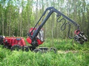 Het bedrijf uit Elspeet heeft vier van dergelijke machines om bossen te onderhouden en daarnaast nog diverse andere machines. 'Met de aggregaat die er nu aan hangt kunnen we bomen tot 50 centimeter diameter snel en eenvoudig verwerken. Bij dikkere bomen hangen we er een andere aggregaat met andere zaag aan.' Op die manier kapt Van den Nagel jaarlijks zo'n 150.000m3 bos. 'Op dit perceel met essen hebben we in een dag zo'n 800 bomen weten te vellen.'