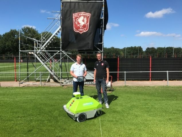 Op het trainingscomplex van FC Twente zijn deze week vier velden belijnd met de Intelligent One, een robotbelijner die geïmporteerd wordt door Milati Grass Machines.