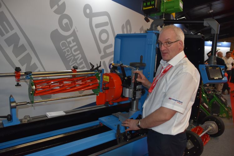 Uiteraard sla je gerenommeerde merken als Sisis en Dennis op de BTME niet over. In de gezamenlijke stand trok een slijpbank van Hunter Grinder echter meer mijn aandacht. De producent blijkt, net als deze maaiermerken, een onderdeel te zijn van de Howardson Group. Accountmanager David Mitchison vertelde trots dat deze nieuwe machine multifunctioneel en volledig automatisch werkt. 'Je kunt er ondermessen, rondsels, slitters en klepels messcherp mee slijpen. Ombouwen kost een minuut; verder is het een kwestie van het materiaal inklemmen en de juiste fabrieksspecificaties invoeren of kiezen op de bijbehorende computer. Vervolgens doe je de veiligheidskap dicht en de machine doet zeer nauwkeurig de rest.' Op een video was te zien dat deze Jupiter ATi op commando zelfs tegelijkertijd tweezijdig kan slijpen! Bij slijpen luistert het zeer nauw en dat gebeurt hier met een tolerantie van 1/1000 inch, ofwel 1/254 mm. Eventueel optredende torsiekrachten compenseert de Hunter met het 200 kg loodzware frame. Dat vormt het hart van deze automatische slijpbank, waarmee je rondsels en ondermessen kunt slijpen tot 42 inch, oftewel 106 cm.