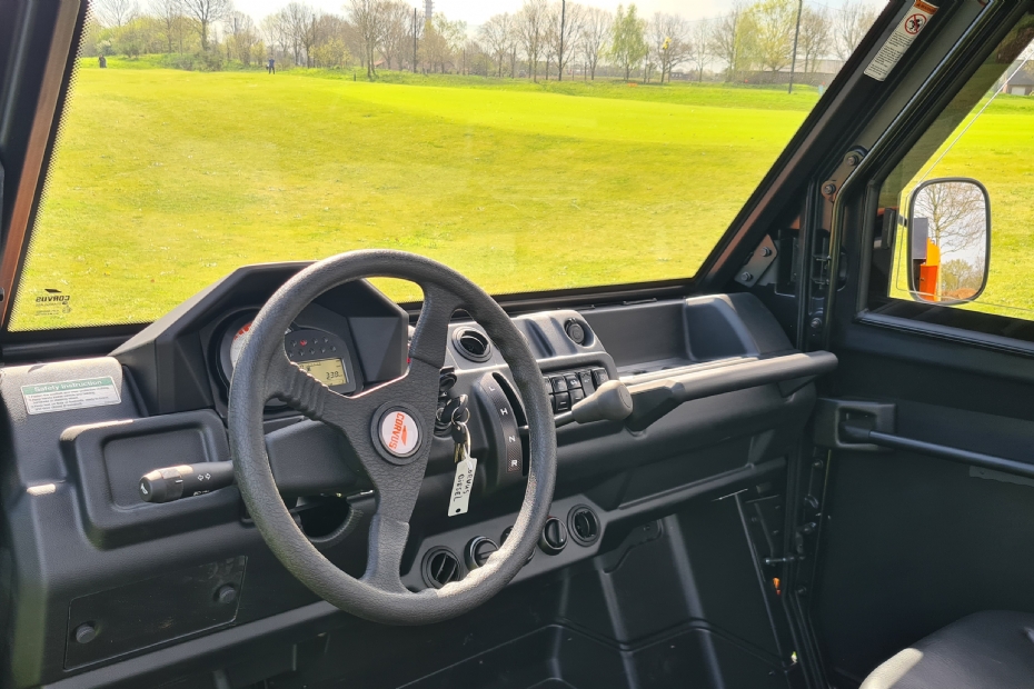 Airconditioning is alleen optioneel op alle DX4-types. Er zitten schuiframen in de deuren; de voor- en achterramen kunnen op de kiepstand open en Corvus heeft ze voorzien van gelaagd glas. Deze machine heeft twee versnellingen, een elektrisch kippende laadbak, een elektrische lier en een trekhaak. Voor de start constateer ik dat hij nog maar 2,8 km op de teller heeft staan. Op de banden met tractorprofiel sprint hij op de bestrating grommend als een tank weg. Al snel bereiken we 50 km/uur. De goed hoorbare driecilinder-Yanmar-diesel wordt zichtbaar zodra je met een schakelaar de laadbak kipt. De schakelaars voor de vele andere functies zitten overzichtelijk op het dashboard. Verder ligt er een afstandsbediening op het dashboard om de geïnstalleerde lier te bedienen. Deze DX4-UTV kent vele afsluitbare bergruimtes, zoals onder de zitplaatsen en onder de voorkap. Zoiets kan een greenkeeper goed van pas komen.