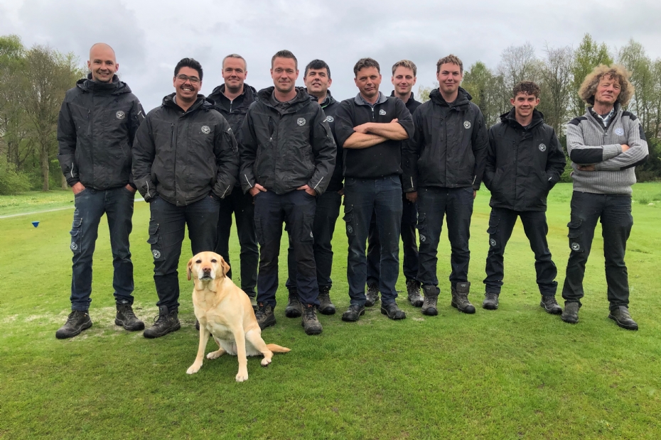 De sfeer in het team is vrolijk tijdens het interview, net als hond Daisy van Nueboer, die sinds corona op de werkplek van haar baasje te vinden is en altijd lijkt te kwispelen. 'Ze luistert heel goed en weet dat ze op het erf moet blijven.' Er verschijnt die dag zelfs taart op tafel om de hoge notering in de categorie 'faciliteiten' van platform Leading Courses te vieren. De taart is geschonken door de clubmanager en is een voorbeeld van de goede onderlinge verstandhouding bij deze bloeiende vereniging. Er wordt veel geïnvesteerd, ook in voorzieningen voor de greenkeepers - niet alleen in het machinepark, maar ook in een modern onderkomen met ruime kantine en voor elke greenkeeper een eigen kledingkast. Nueboer: 'Ik vind het belangrijk dat alles goed geregeld is en dat betaalt zich terug. Niemand is te beroerd om een extra stapje te zetten als dat nodig is.'