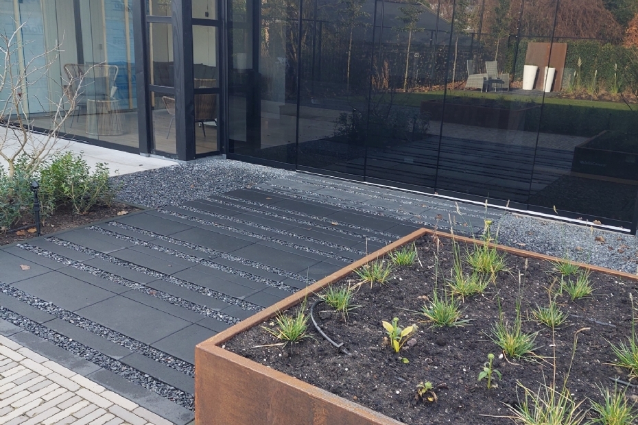 To create depth and elevation in the garden, Deco Tuinen used rectangular corten steel planters from Adezz. Corten steel edging was also applied to separate the gravel from the soil. 'We've worked with Adezz from Uden for about ten years now. We continue to use their products because of their appearance, durability, and low maintenance. We also appreciate the variety and innovation they offer,' says Van Duijnhoven. 'However, Adezz products have become significantly more expensive over the years, which makes them too costly for some clients. That's unfortunate. For this reason, we don't use their custom-made products very often, as custom work is more expensive than standard products—though we understand that customization naturally comes at a higher cost.'