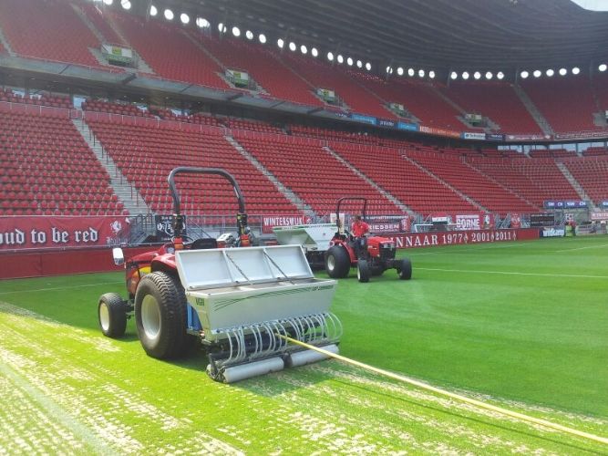 Met eigen ogen hebben we het resultaat van deze bewerking kunnen aanschouwen. Er ligt een perfecte grasmat in de Grolsch Veste. De Weerd is dan ook dik tevreden: 'Er is veertig kuub zand met voeding in de toplaag aangebracht. De beworteling heeft zich inmiddels uitstekend ontwikkeld. Er was overvloedige regenval, maar het waterafvoer vanuit de toplaag naar beneden was geen probleem. Tijdens de bewerking was de machine afgesteld tot aan de ondergrondse veldverwarming. En ook deze heeft de behandeling door de Top Changer schadevrij doorstaan', aldus een zeer tevreden groundsman. 'Ik kan deze behandeling dan ook bij iedere club ten zeerste aanbevelen.'